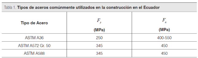 En el Ecuador existen básicamente tres tipos de aceros estructurales utilizados en la construcción, según se muestra en la Tabla 1. Estos aceros son utilizados para la construcción de todo tipo de infraestructura, como son puentes, edificios, torres, etc.